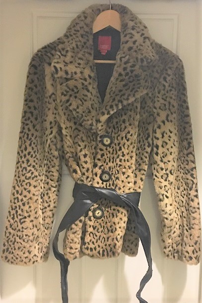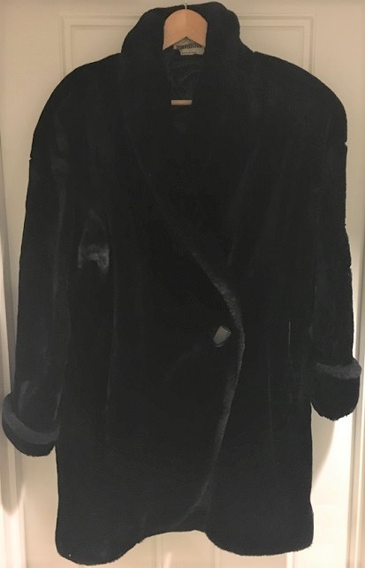 Description: Black woman synthetic fur coat. Medium size. By Donnybrook. Made in USA.